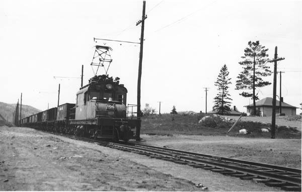 Typical ore train hauled by 100-ton number 118. Collection of Dave Shaw Ore was once (1947) handled in trains of 30 drop bottom cars of 80-ton capacity hauled by two 50-ton (or, one 100-ton) electric locomotives. Daily production in 1947 was 30,000 tons.