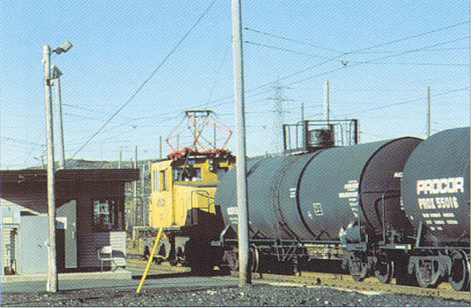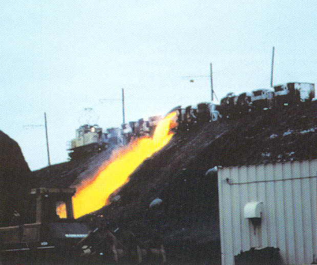 Molten slag was removed from the plant in special slag pot cars and taken about 3 miles to be dumped as waste. Slag temperatures range from 1,200 degrees F for nickel to 1,600 for cobalt. This operation took place about every 2 to 3 hours, 24 hours a day using 10 car trains requiring two electric locomotives Coniston smelter: Eight miles of track were once required here along with interchange tracks with the CNR and CPR. Two 80 tons steam locomotives were once used here. Levack Mine: Three miles of yard track and a four-mile spur to the CPR existed here. Ore, in 60 and 80-ton bottom dump cars was hauled by the CPR 21 miles to Specher for Copper Cliff or 32 miles to Coniston. Creighton Mine: Yards at No.3 and No.5 shafts consisted of six miles of track. Ore was hauled by the CPR eight miles to Clarabelle for the Copper Cliff plant, and 19 miles to the Coniston smelter. Garson Mine and Garson sand pit: Located 12.5 and 8.7 miles from Clarabelle, were served by CNR using 8 miles of spur and a further 3 ½ miles of sidings and yard trackage. CNR used 80-ton drop bottom dump cars. Lawson Quarry: Located 66 miles from Copper Cliff on the CPR's Little Current branch it supplied quartzite shipped in CPR bottom dump cars. NOTE: Both sand and quartz is used as furnace flux and as mine backfill. Coal and oil: Large quantities of coal were shipped to the Sudbury area mines and smelters along with other industries and domestic use along with CPR's own locomotives for many decades. Much of it arrived by ship at the Little Current coal dock for movement by rail. Coal continued in use for some years after the railways dieselized in 1960. In the 1970's INCO changed over to Bunker C oil shipped in unit trains by CNR from a Montreal East refinery where it was largely a waste residue left over after gasoline, diesel, furnace oil, asphalt etc. had been made. Tipple