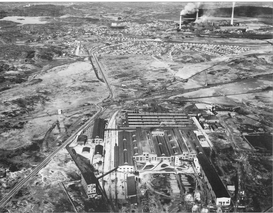 Another view of the INCO Copper Refinery, town and smelter in background, c.1950's. Ontario Archives AO 3307