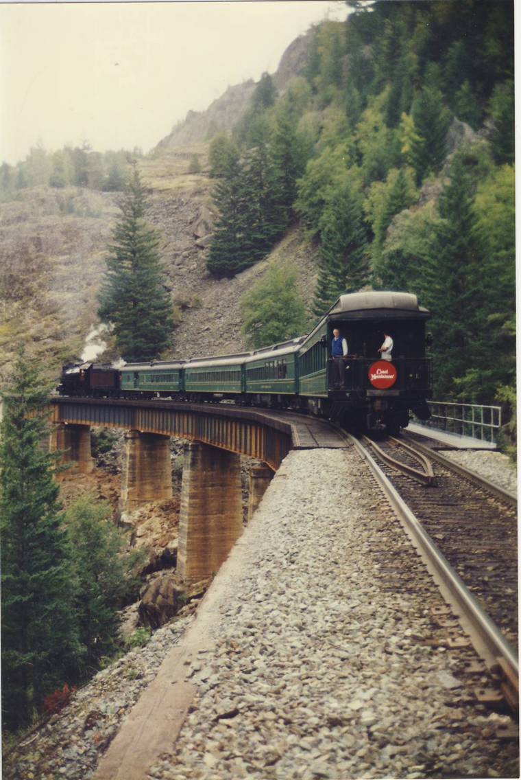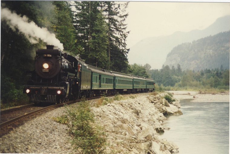 posed at Brackendale. . Posed in the Cheakmus Canyon. Consist: 301 combine, ex CN 7196 Pullman 5/1919 803 coach, ex CP 2806 NSC/CPR 1/1924 741 Buffet-observation ex CP 35 business car. NSC/CPR 4/1928 Mount Cascade observation car, ex SP 2914. Pullman 1930 Note: All this rolling stock remains stored in New Westminster. 3716 still operates in BC on the Kettle Valley Steam Railway. This NRHS BC Chapter trial run was a precursor to a