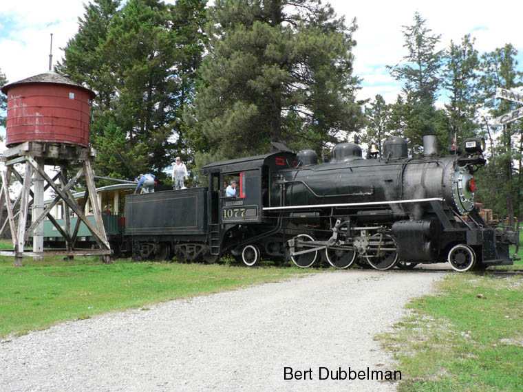 Former MacMillan and Bloedel 1077 ( MLW #65377 12/23) operated beyond its logging days thanks to the Province and finally wound up here with a far easier task hauling tourists along a short track in Fort Steele. June 18, 2006 |