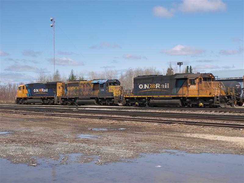 Resting with SD75I 2102 and SD40-2 1733, 1730 will soon be helping power train #211 to Rouyn-Noranda, Quebec.