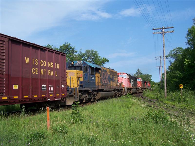 Tacked on to 450's power behind 2 44-9CW's and an SD75I, 1733 is snuggled up against a Wisconsin Central 50' paper box. Looking kinda shoddy, hopefully the ONR will soon rebuild and repaint is into the flashy ONRail scheme like 1730, 1734 and 1735.