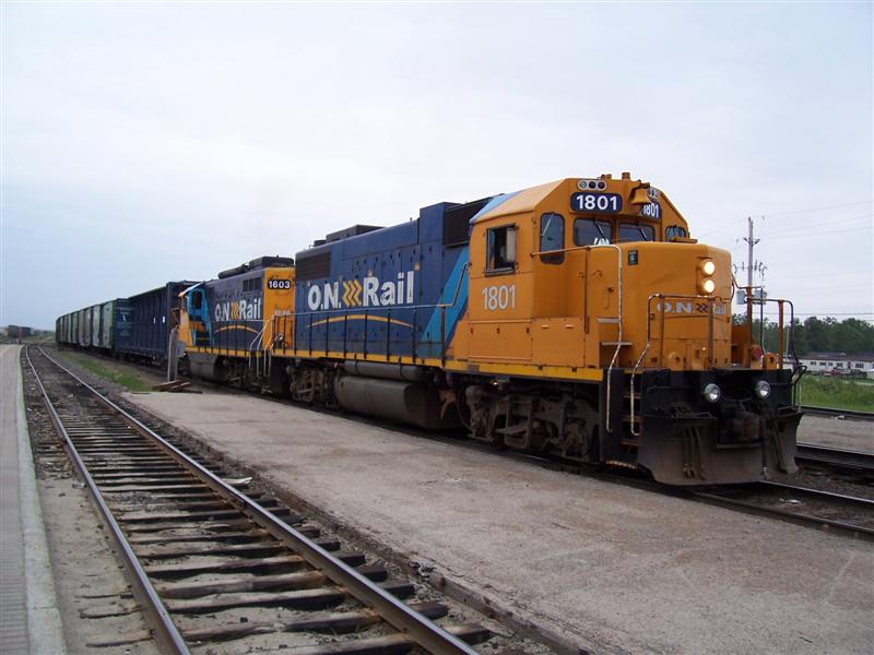 GP38-2 1801 and GP9 1603 (with the guts equivalent to a GP38-2) prepare train 313 to Kapuskasing today. 1801 desperately needed a paint job when rebuilt, most of the yellow was missing off the long hood!!