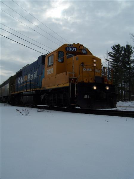 GP38-2 1801 loading passengers at Washago with the Northlander. Like normal, the train is late, this time due to a CN track gang.
