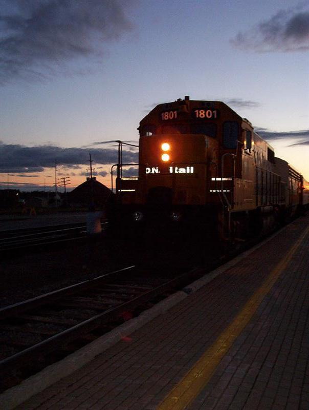1801 and FP7Au 2002 arrive in from Moosonee with the Polar Bear Express. Because of Cochrane being situated on the 49th parallel, the sky is still glowing at 1010 during the summer months.