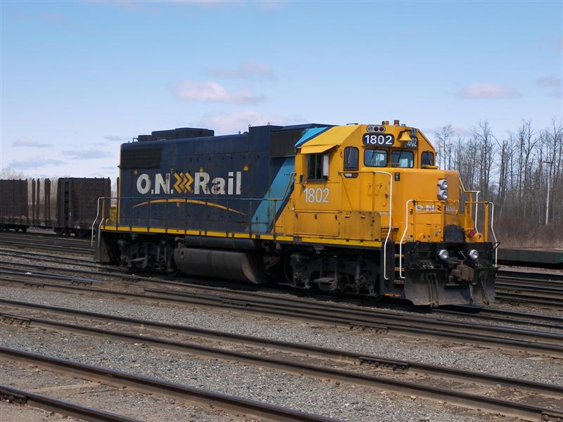 Working the Englehart yard job, you can see the colour variation on the nose of GP38-2 1802 after getting a nose job last fall in the North Bay shops.