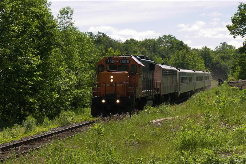 In charge of train #697, GP38-2 1806 leads an APU and 3 rebuilt Hawker Siddeley commuter coaches towards the station stop at Washago. Like normal the train is late; 20 minutes today.