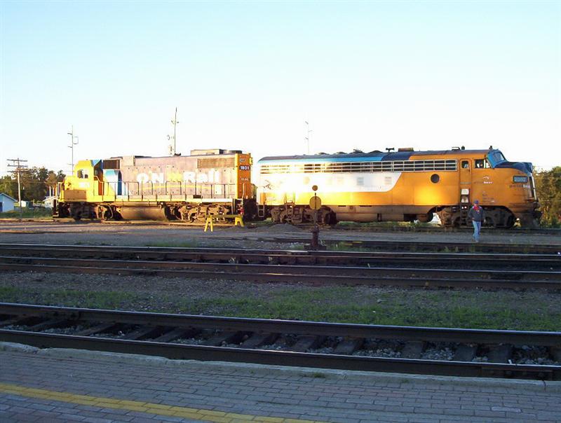 FP7Au 2002 rests near the station with GP38-2 1801. These two units will power today's Polar Bear to Moosonee. 2002 is the former FP7A 1521. She was rebuilt with a Cat motor in 1997.
