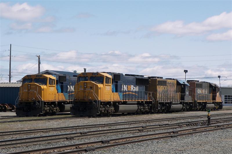 Sitting by the servicing area of the Englehart yard are 2 sets of power. SD75I 2101 solo will likely lead train #213 to Cochrane and return with #414. SD75I 2102 with SD40-2's 1733 and 1730 will likely lead train #211 and return as #512. #308 is enroute from Timmins now, and after these 2 trains return they will be marshalled into trains 208 and/or 214 for the trip to North Bay. From there any traffic going to the OVR/CP will be sorted out, and the rest will be tagged behind CN power for it's trip to Toronto as CN 450.
