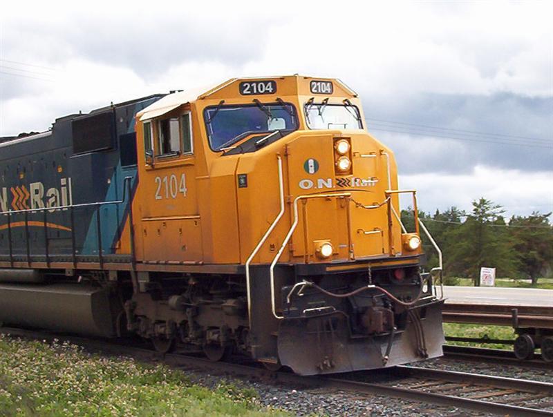 In your face!!! 2104 leads train 213 solo past the siding at Potter. Sitting in the siding is some work equipment that 213 had to wait for to clear before proceeding.