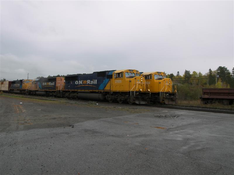 2105 leads 1730 and 2100. The engines are heading to North Bay with train 208 as they pass the Dream Catcher in Temagami.