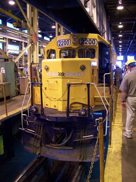Newly acquired GP40-2 2200, is receiving some routing maintenance in the North Bay shops. Work also includes new draft gear on the unit. Members of the ONRH&TS inspect the unit.