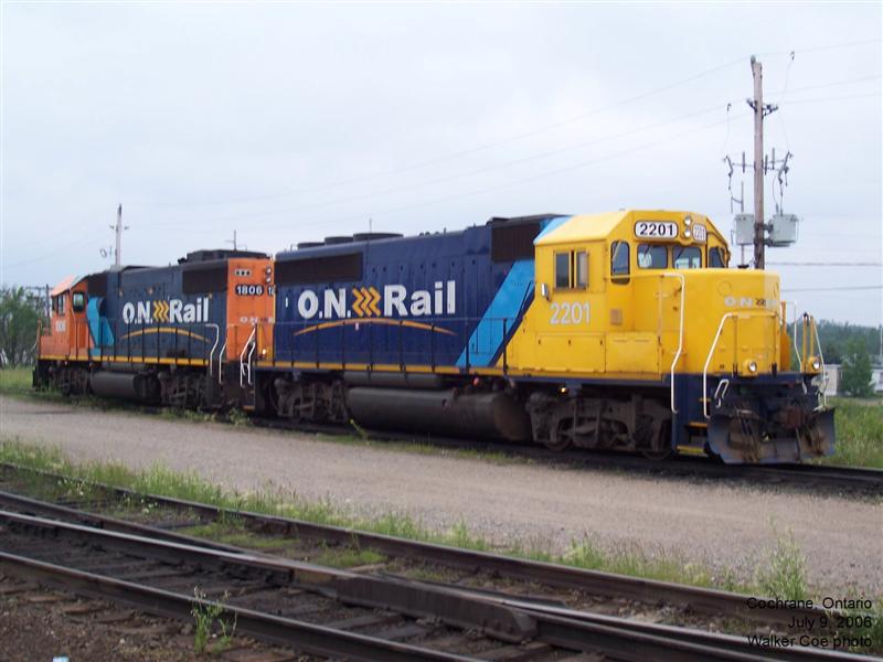 Newly acquired GP40-2 2201, ready to lead 313 to Kapuskasing. GP38-2 1806 will assist with the ponies. The 2200's look almost canary yellow, while the 1800's look pumpkin orange.