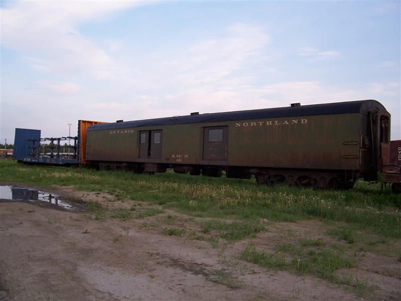 Still wearing her 'as delivered' paint scheme, Baggage 411 is now a portable parts shed for Ontario Northland's rail coaches. Connected with it is the home built 'Canoe Car'.
