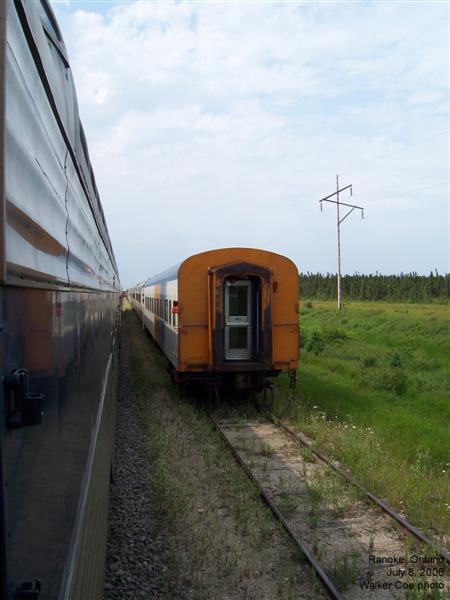 3 times a week during the summer months, this is a ritual for ONR trains on the Island Falls sub. The year round 'Little Bear' takes the siding for the summer only 'Polar Bear Express'. Today the meet was a little sloppy. The mixed was a little too far out, so the excursion had to ease back a bit, and still had to stop and wait for a few minutes.