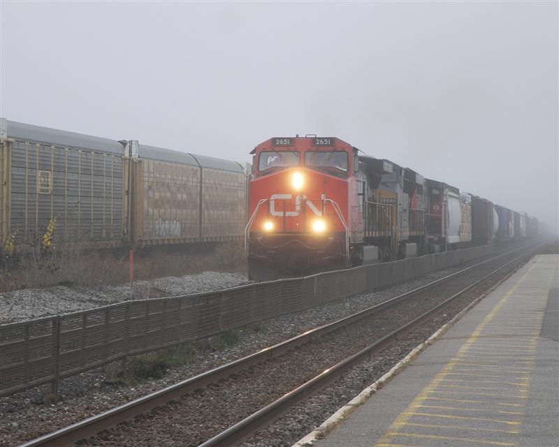 9-44CW 2651 leads CSX ES44DC 5222 and CN SD40-2(W) 5286 in the fog.