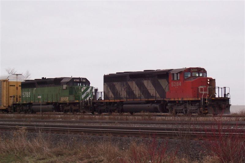 CN SD40-2W 5284 leads BNSF SD40-2 6785, ex-Burlington Northern westbound out of Oshawa yard.