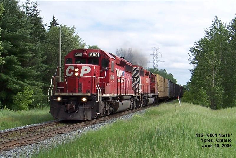 Leading train #435, CP 6001 and 5725 pull away from the siding at Ypres. With SBU problems, the train stopped to have the crew of 434 test the communication between the head end and tail end.