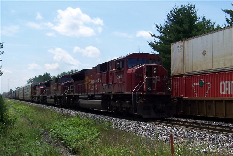 Leading train #103, CP 9146, 9119 and 9772 blast by Mile 59 Mactier Sub. enroute to Mactier. Engineer Whitney is hanging out the window waving.