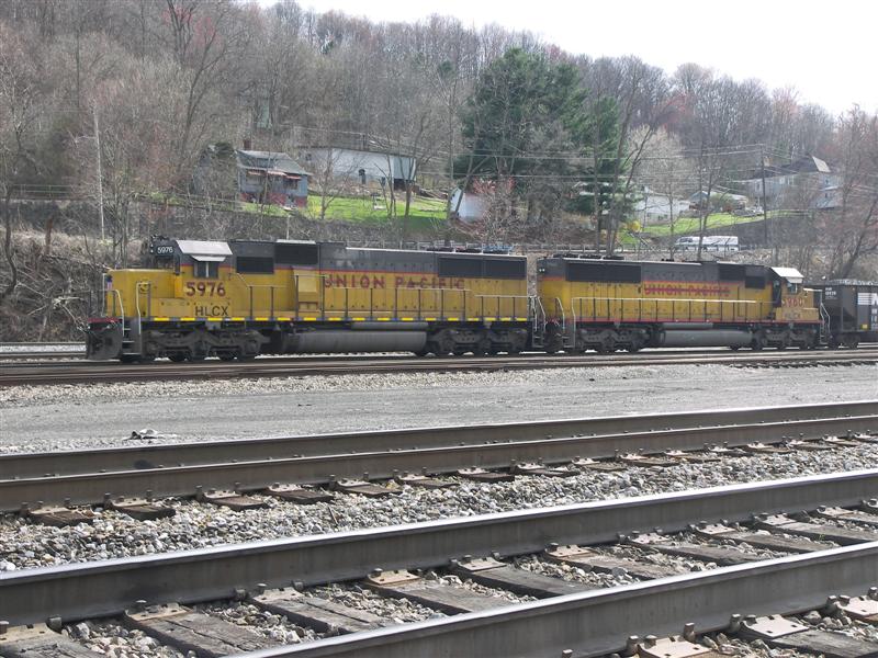 Ex-Union Pacific (now owned by Helm Financial) SD50's 5976 and 5960 head a short eastbound coal drag at the east end of NS Bluefield Yard
