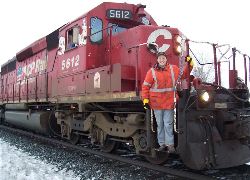A little about me now. Here I'm seen standing on the front of CP SD40-2 5612 (in the ugliest paint scheme imaginable!). This is the day after I wrote my final exam to qualify as a conductor. I passed it with a 96%, averaging 95% through the course.