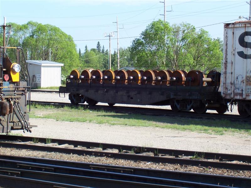 An loaded wheel car waits in Cochrane Yard. These cars haul wheels all over the system.