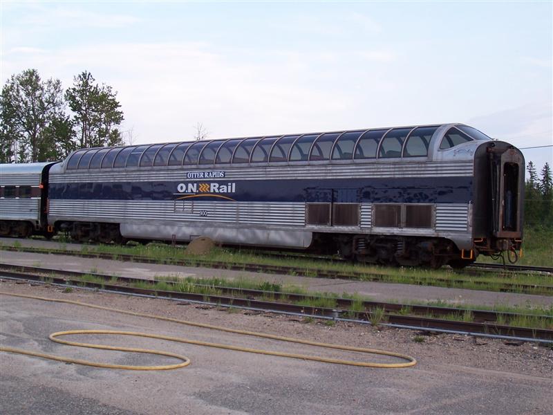 Born unto Milwaukee Road, ONRail 900 a.k.a "Otter Rapids" rests with a sister former BCRail dinner train coach in Cochrane yard. This is the first coach of the dinner train to be repainted. The APU was done immediately after purchase.