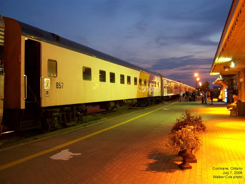 The 'Heritage' end of the Polar Bear Express consist. The train has just arrived, and a few passengers are still lingering on the platform.