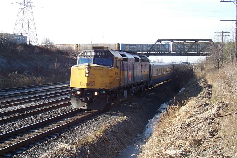 On the point of train #56 to Montreal, 6416 leads 3 LRC coaches out of Oshawa. Also in tow is P42DC 904 to Ottawa with 3 more LRC cars. Like the crew on 60 yesterday, this crew also honked and waved at me as I stood there drooling!!