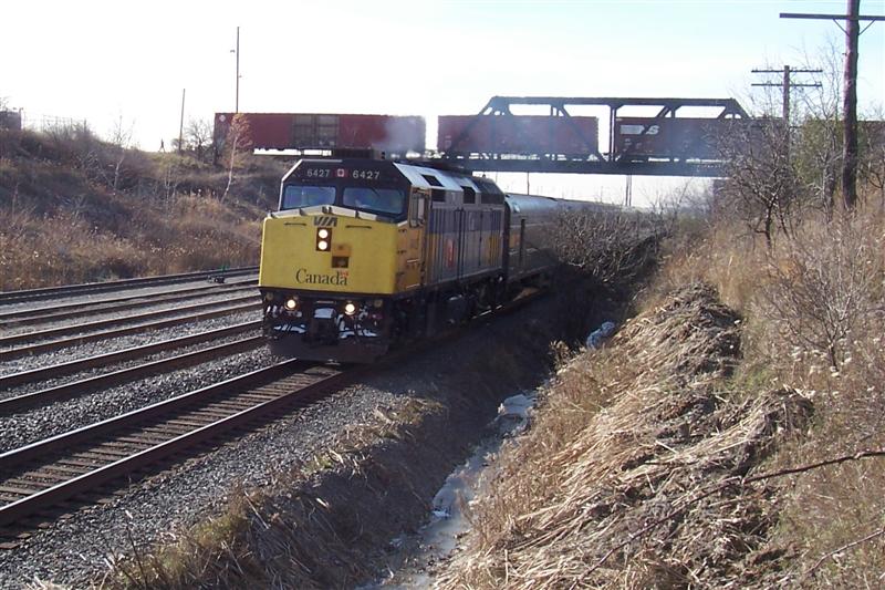On the point of train #60 to Montreal, 6427 leads 6 stainless coaches away from the Oshawa station.