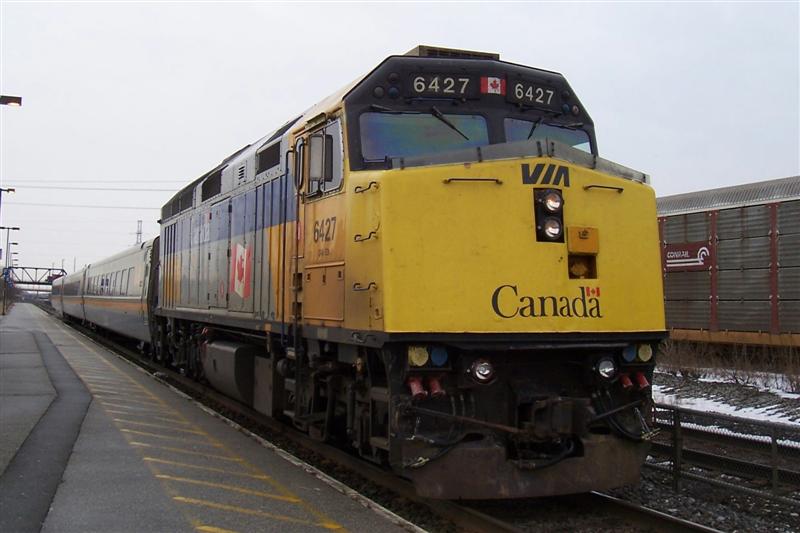 On the point of train #41 from Montreal, 6427 leads 3 LRC coaches at Oshawa station. Notice the difference in yellow from the nose to the side of the cab. This unit is looking pretty sad.