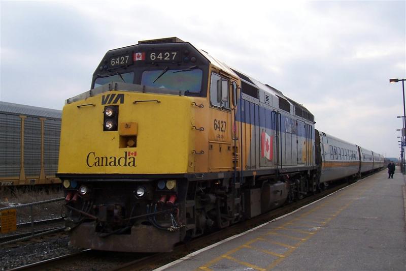 On the point of train #64, 6427 leads 3 LRC coaches at Oshawa station. Notice the difference in yellow from the nose to the side of the cab. This unit is looking pretty sad.