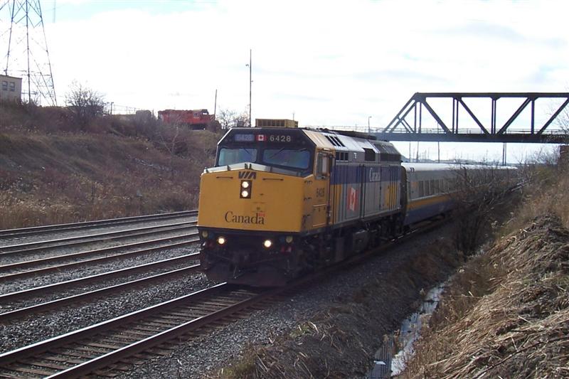 On the point of train #44 to Montreal, 6428 leads 4 LRC coaches away from the Oshawa station. Note the CP GP9u 1602 switching in the Oshawa yard above the CN mainline.