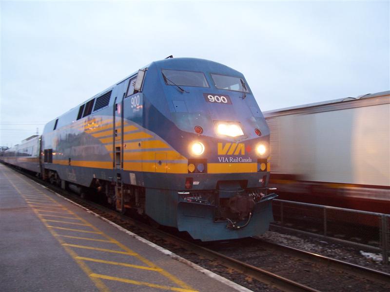 The class P42DC #900 leading train 45 with 3 LRC and 4 Budd cars at Oshawa. The train was just too slow arriving to catch the head end of 148 with the 900.