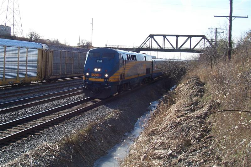 Train 44 consisting of P42DC 903 and 3 LRC coaches. Note the water in the ditch turning to ice.