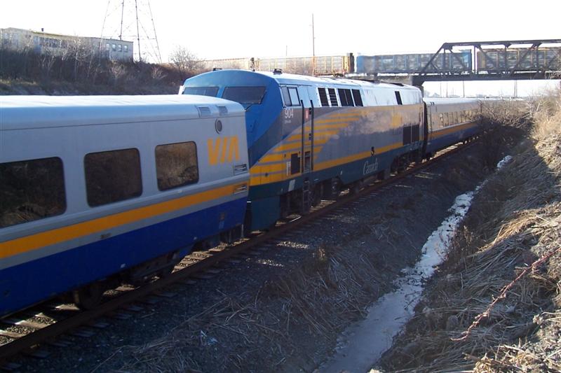 Tied onto the back of train #56 to Montreal, P42DC 904 on train 42 leads 3 LRC coaches. This train will cut off at Brockville and will continue to Ottawa.