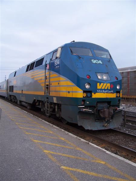 Leading train 45, 904 is in command of 4 LRC coaches on a balmy February day.