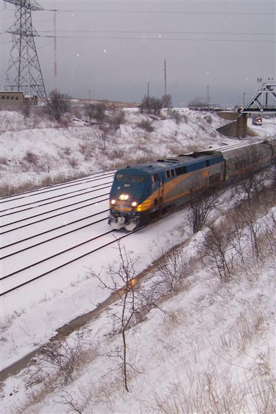 The leading unit on a joined train to Brockville, 907 lugs away from the Oshawa station. Mother nature graced us with some snow last night, a very big surprise at 0720!!