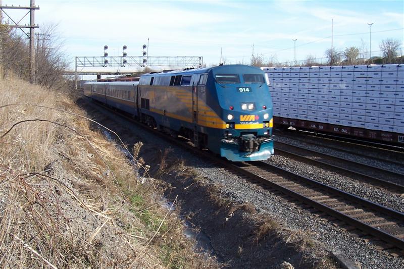 A very late train 53 consisting of P42DC 914 and 3 LRC coaches. This train came by at close to track speed, and didn't stop at the Oshawa station.