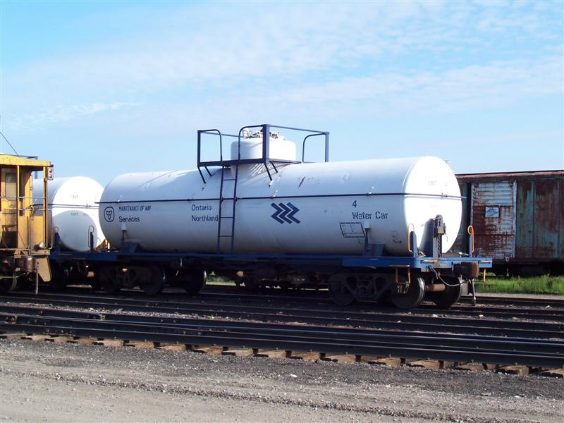Rebuilt tank car, now serving the ONR as a water car waits in Cochrane Yard. These cars serve on work trains carrying fresh water all over the system.