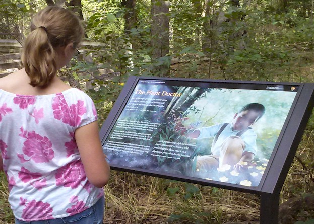 Karri reads a National Park Service sign explaning who George Washington Carver was