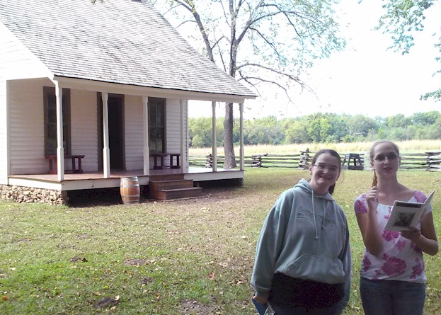 Kandace (left) and Karri (right) explore the restored Carver family cabin at George Washington Carver National Monument