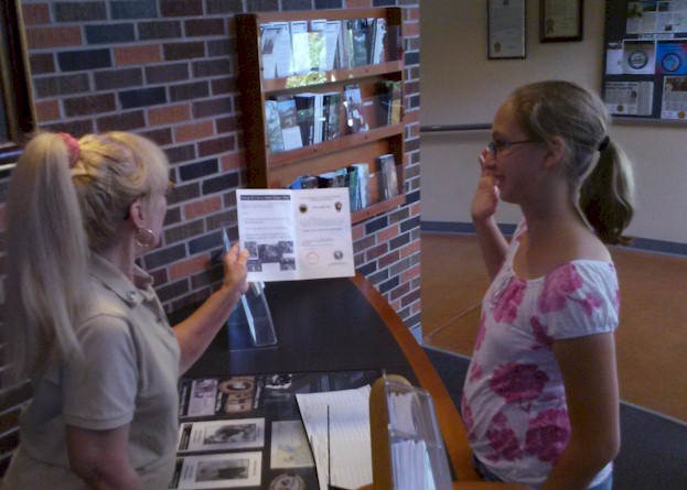 Karri gets sworn in as a George Washington Carver National Monument Junior Ranger at the end of our time there