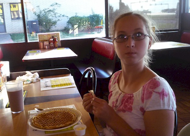 Karri enjoys her peanut butter and chocolate waffle at the Waffle House near Rolla, Missouri