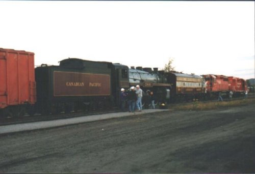 CP 4-6-4 2816 and FP7A 1400 (in the "original" maroon and grey) just after arrival in North Bay for its overnight stay September 16, 1998. Many RaiLink employees and railfans were waiting on the platform of the North Bay station most of the day, for the arrival of the train.