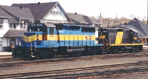 Helm SD40-2 6213 (ex-DM&E 6387) at Sudbury Ontario, with the CP Rail yard office and VIA Rail station in the background. Sitting on yard track 1