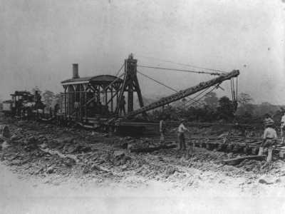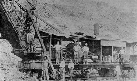 Marion Shovels were used extensively on the Panama Canal. In May, 1912, this 5 cubic yard rail truck mounted Model 91 set a world's record by loading 5,554 cubic yards.