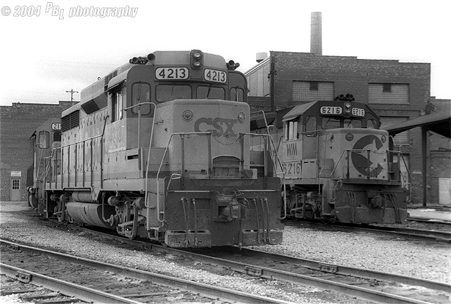 Several CSX engines idle outside of the Wyoming Yard enginehouse waiting for their next assigments in 1988.