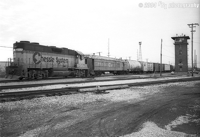 An ex-Chessie GP38 drills the east end of the CSX Wyoming Yard in 1988 as Plaster Creek tower stands watch. Cars being classified include a CSX maintenance of way car.